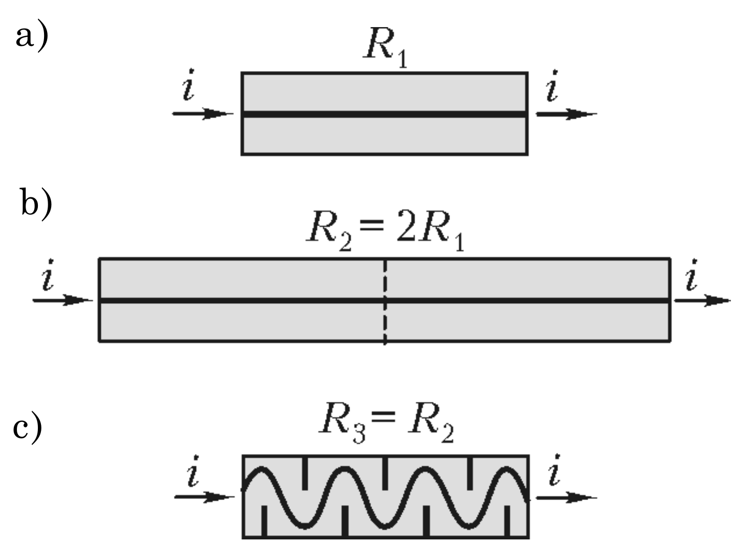 Let’s say (Fig. 2,a) an electric current i passes into the metal through a resistance (resistor) of value R₁, and then exits from it. How to double the resistance? The natural idea is to double its length (Fig. 2,b).