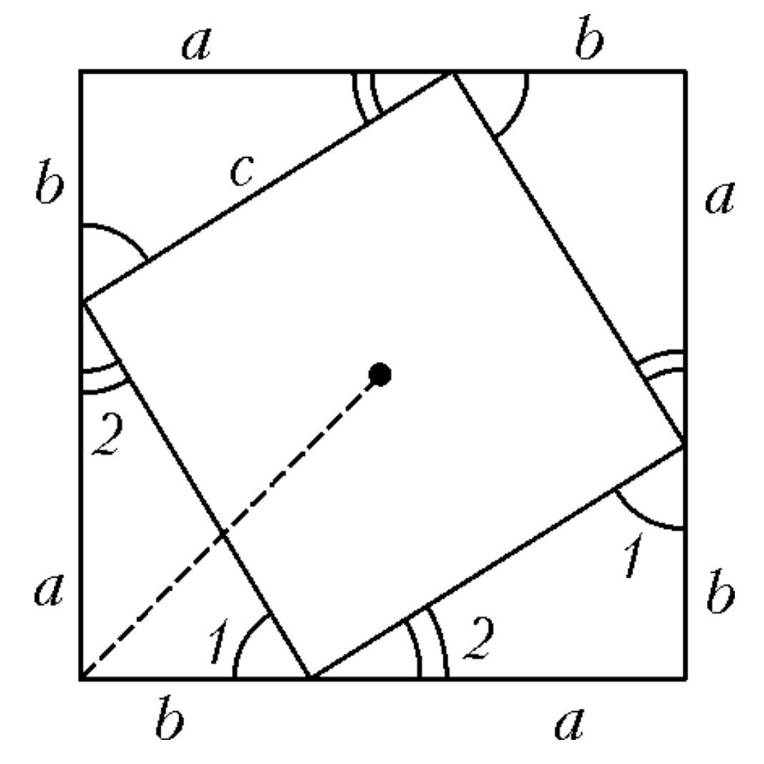 Problem 1-9. Answer: The cyclist will arrive earlier. Since the cyclist covered a third of the way before the motorcyclist covered two-thirds, the cyclist’s speed is more than half the speed of the motorcyclist. Problem 1-10. Answer: \(\frac{\sqrt{2}}{2}(a + b)\). Attach triangles identical to the given one to all sides of the square externally, so that their catheti form extensions of each other - see Figure 3. The catheti of these triangles form a new square whose center coincides with the center of the original one. The sought distance is equal to half the diagonal of the new square, which leads to the answer.