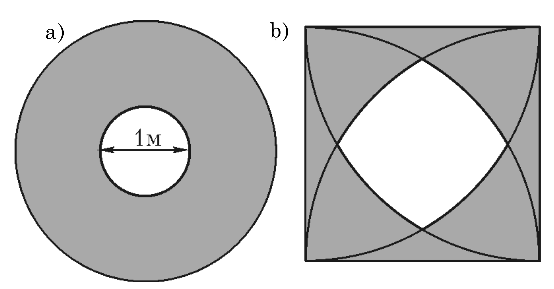 Problem 1-14. a) Answer: All points of the ring with inner diameter 1 m and outer diameter 3 m (in Fig. 4a, this ring is shaded). It’s clear that the grasshopper can’t get closer to the center of the room than half a meter. To show that the grasshopper can reach any point in the specified ring, we first need to show that it can reach any point along the wall.