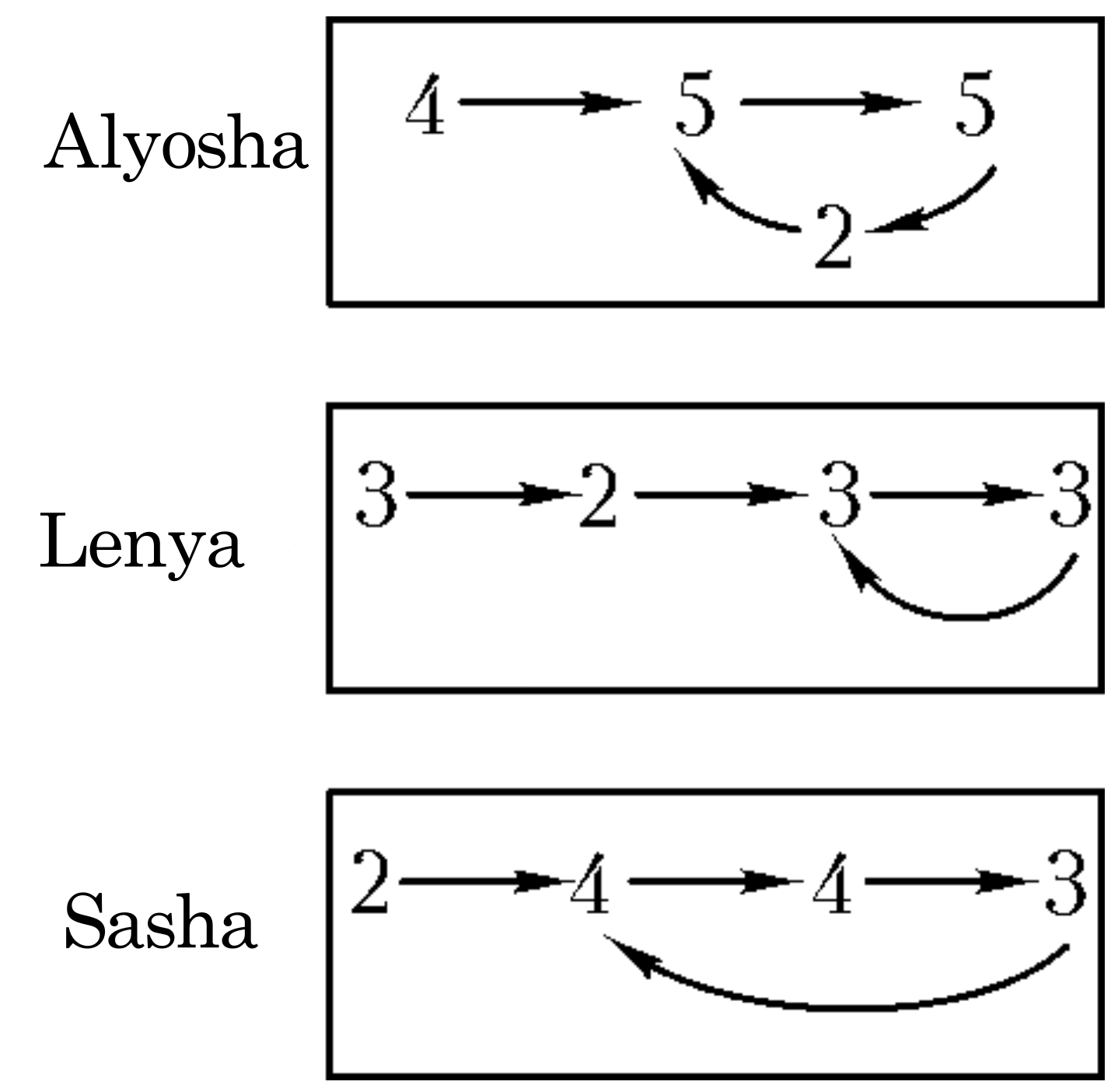 Problem 1-22. Answer: Alyosha and Sasha will get grades of 4, and Lenya will get a grade of 3. Starting to write out the grade sequences for each of the boys, we find that from a certain point they repeat periodically. This is schematically shown in Fig. 7. After calculating the average values of the grades, we get the answer.
