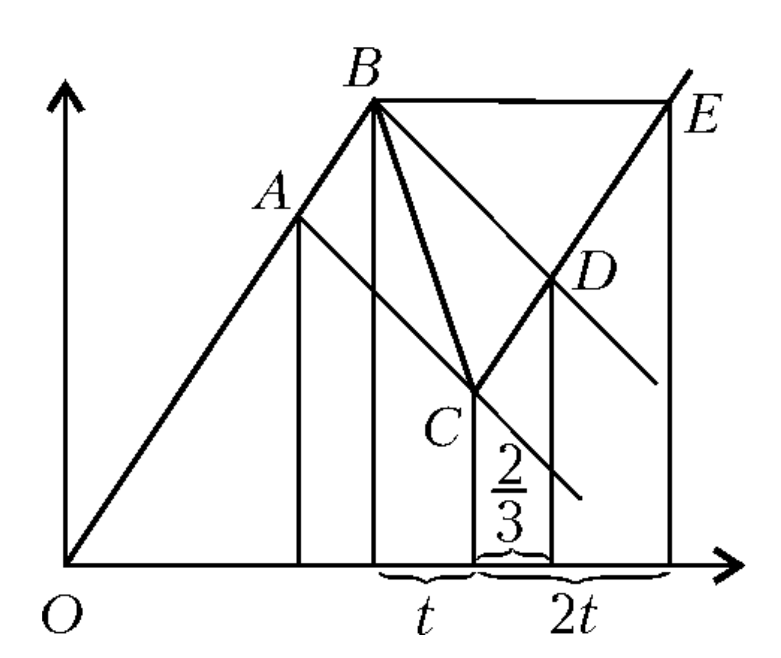 Point A of the graph corresponds to the moment when the mathematician threw the hat, AC is the graph of the hat’s movement. Point B corresponds to the moment when the mathematician threw the stick, BD is the graph of the stick’s movement.